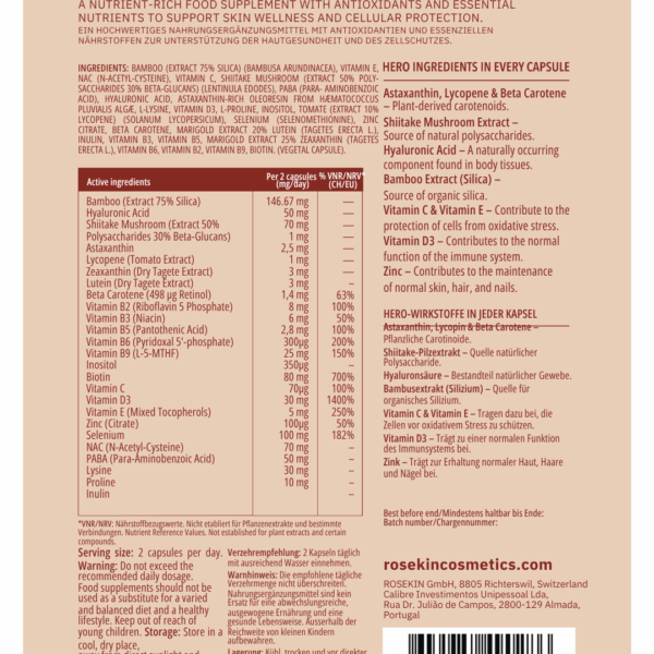 Die Formel unterstützt die Haut von innen, indem sie zum Schutz der Zellen vor oxidativem Stress beiträgt, die normale Hautfunktion unterstützt und hilft, Hautfeuchtigkeit und Elastizität zu bewahren. In Kombination mit einem täglichen Sonnenschutz stärkt sie die Widerstandsfähigkeit und Ausstrahlung deiner Haut.