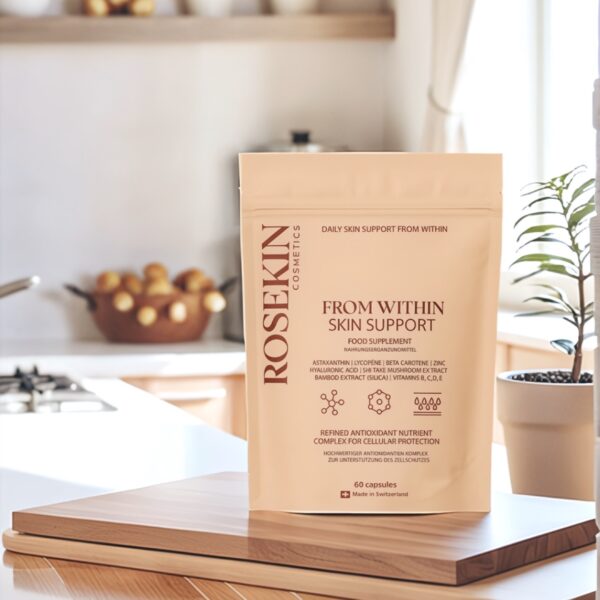 From Within – Skin Support von RoseKin ist ein hochwertiges Haut-Supplement, entwickelt in der Schweiz, um deine Haut von innen zu unterstützen und sie bei der Abwehr von oxidativem Stress durch Umwelt- und UV-Einflüsse zu begleiten. Es ersetzt keinen äusserlichen Lichtschutz, ergänzt jedoch deine tägliche SPF-Routine ideal, indem es die Haut nährt und ihre natürliche Regeneration unterstützt.